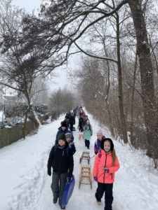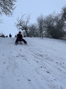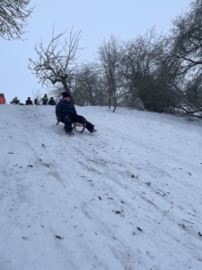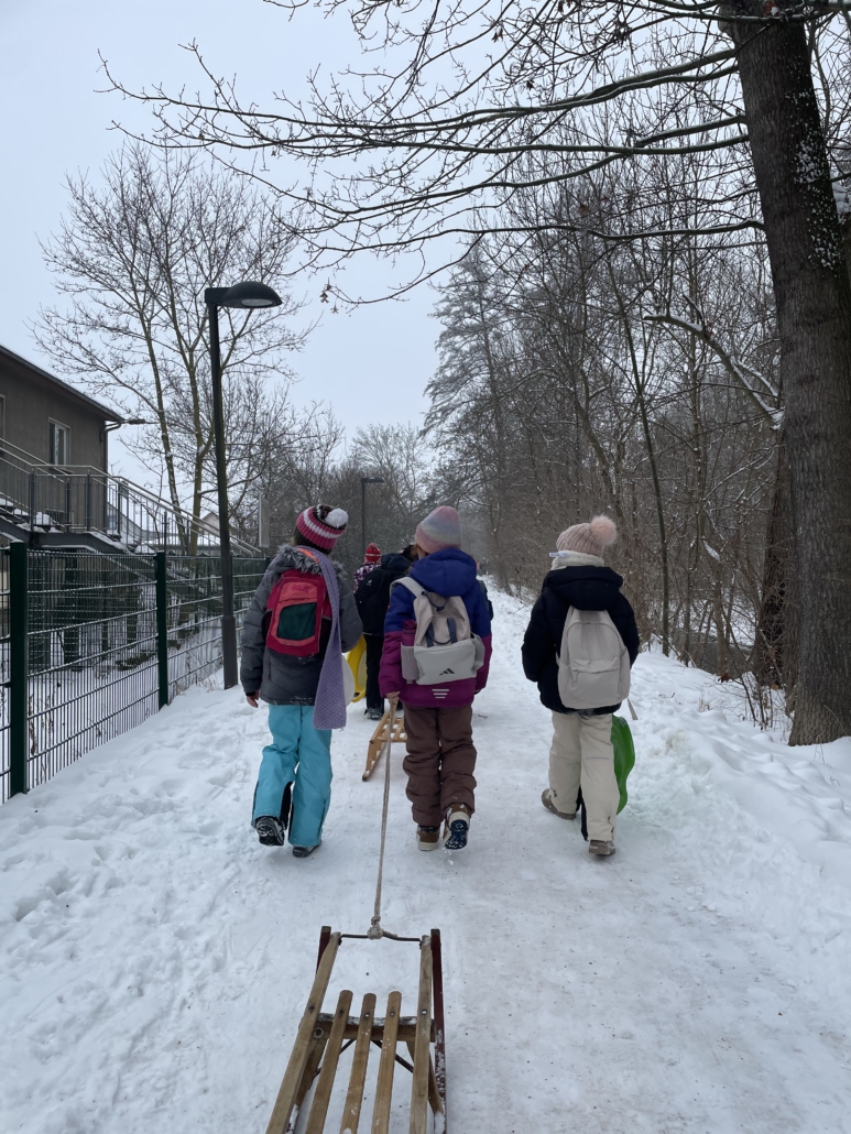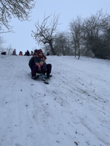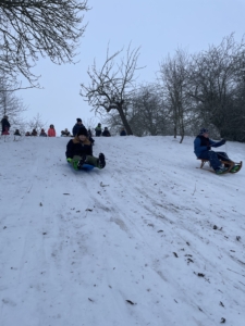 Wir verbrachten anschließend einige fröhliche Stunden am Rodelhang im Schnee. Mit Musik, viel Bewegung und guter Laune wurde gespielt, getanzt und gelacht. Die Kinder rasten mit Schlitten und verschiedenen Po-Rutschern um die Wette und hatten großen Spaß dabei.